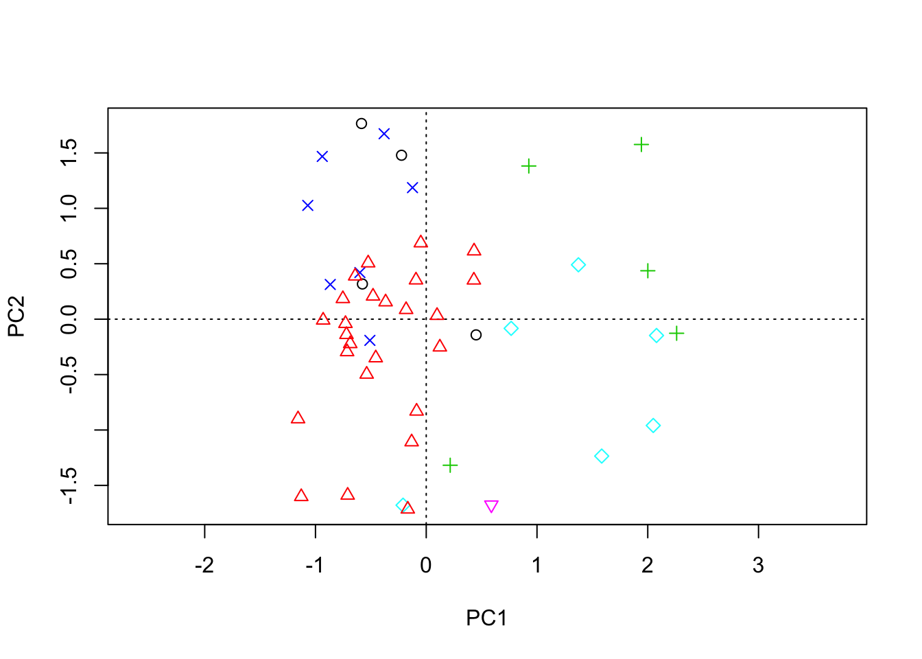 points(PCA, pch=vegtype, col=vegtype)