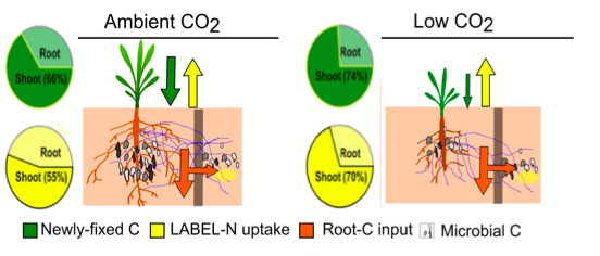The goal of this project is to investigate how plant carbohydrates control arbuscular mycorrhizal fungi-mediated nitrogen transfer. Using isotopic labeling (13C and 15N) technology, we have shown that plant C limitation does not reduce N transfer from arbuscular mycorrhizal fungi (AMF) to Plantago lanceolata. Instead, we have revealed greater N-for-C exchange efficiency between plant and AMF under plant C limitation (low CO2 concentration). C-limited host plants with AMF optimized the use of resources by increasing both C and N allocation to shoots to alleviate C limitation. This project was funded by Max Planck Institute and DAAD.